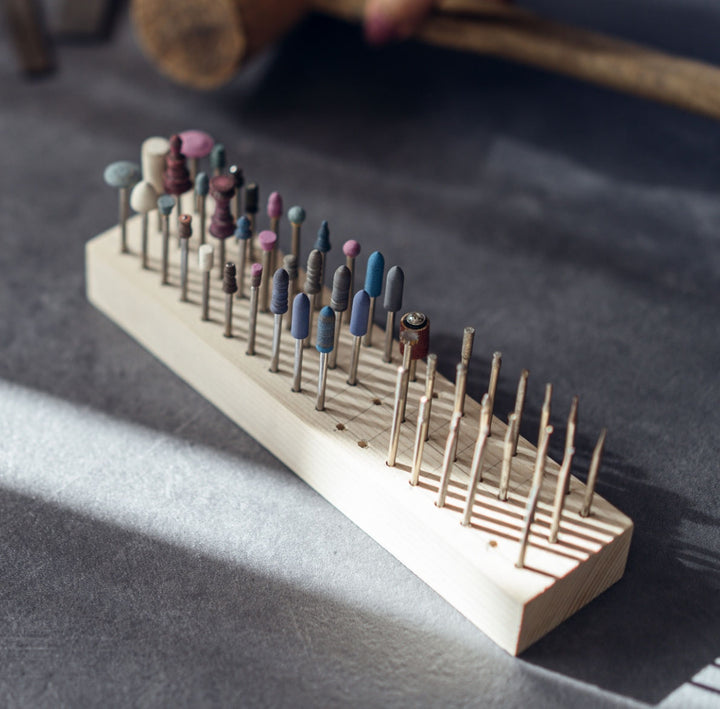 リューターで金属をヤスったり、磨いたりするに取り付けるビット。様々な形、荒さがあり、作業内容で取り替えながら制作します。