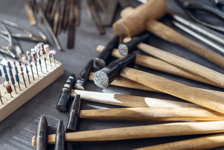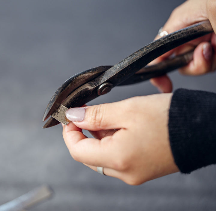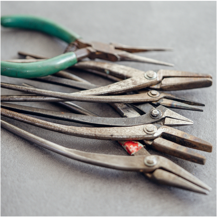 彫金とは、貴金属や銅などの金属を鏨(タガネ)やヤスリ、金槌などを用いて加工する技法のことです。鋳造のように一つの型から量産しているわけではなく、一つひとつ時間をかけて、手仕事でオリジナルのジュエリーを制作します。その表現の幅は無限大で、今も進化し続けています。